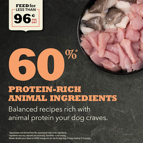Acana puppy large breed ingredients. Large breed puppies are best fed a diet rich in meat and protein to develop muscles and manage body weight reducing stress on developing bones and joints. Recipes with grains do have a higher cost than grain free formulas. The first ingredient is chicken. This acana large breed puppy review is going to walk you through key details about this company and its philosophy on quality dog food.