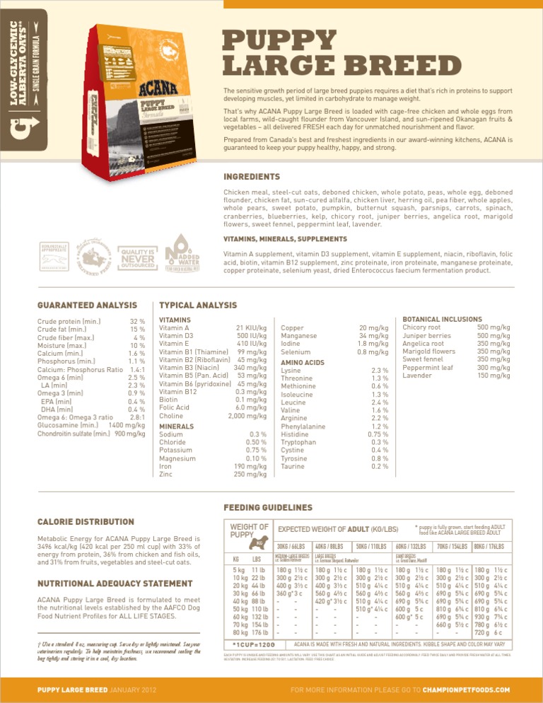1 2 fresh or raw poultry fish. Your large breed puppy has unique nutritional needs in order to support their rapid growth and bone development including more protein and fat from whole animal ingredients. Acana adult large breed is loaded with free run chicken wild caught flounder and cage free eggs in nourishing wholeprey ratios of meat organs cartilage and bone delivering everything your dog needs for peak health in the most natural and bioavailable forms. Acana puppy large breed is packed with free run chicken and wild caught flounder in wholeprey ratios of meat organs cartilage and bone with the added nutrition of delicious cage free eggs for a diet that gives your growing puppy everything they need to grow up healthy happy and strong.
