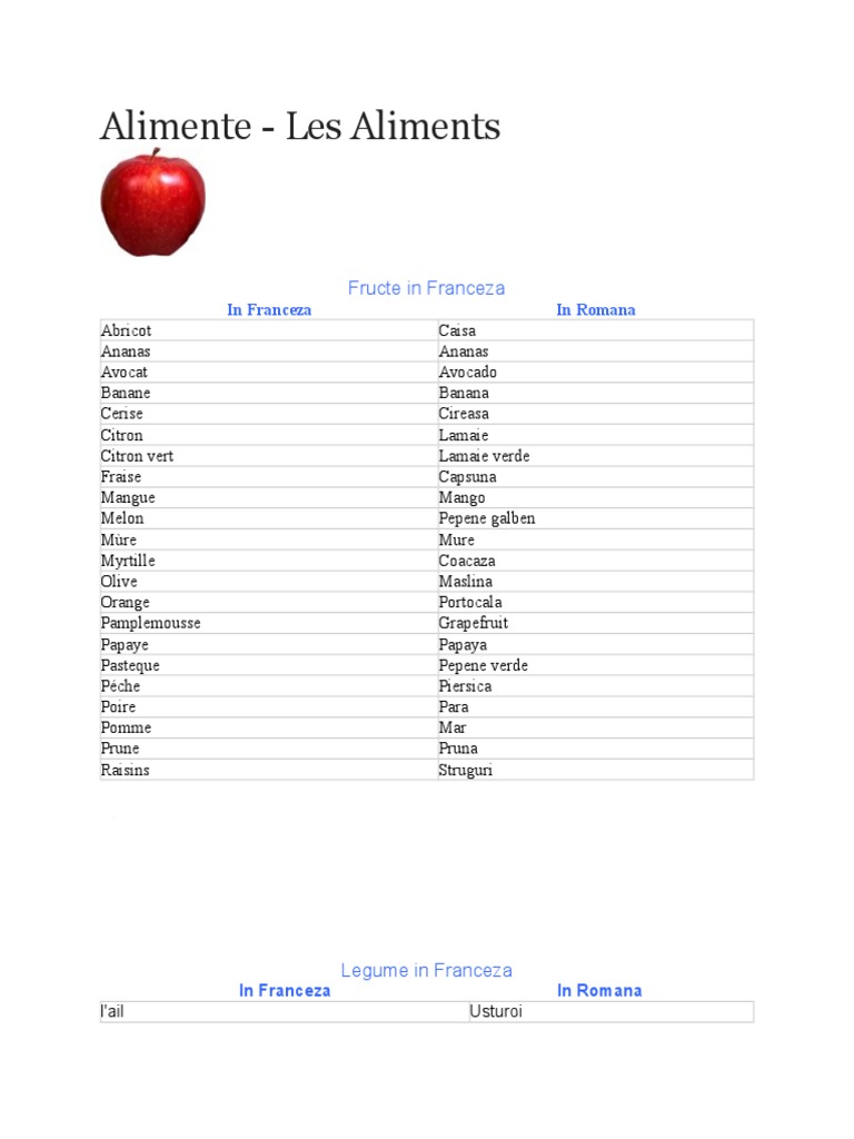 In paranteze se gaseste pronuntia scrisa a cuvintelor in limba franceza. Cel mult 60 din populatia brasovului e constienta de efectele poluarii datorate cantitatilor mari de gunoi menajer. In aceasta lectie veti invata denumirea si pronuntia celor mai comune fructe si legume in franceza. L amande f migdală la pomme măr l abricot m caisă la banane banană la peau de banane coajă de banane la baie fructă de pădure la mûre mure l orange sanguine portocale roşii la myrtille afine la cerise cireșe la figue smochină le fruit fruct la salade de fruits salată de fructe les fruits m.