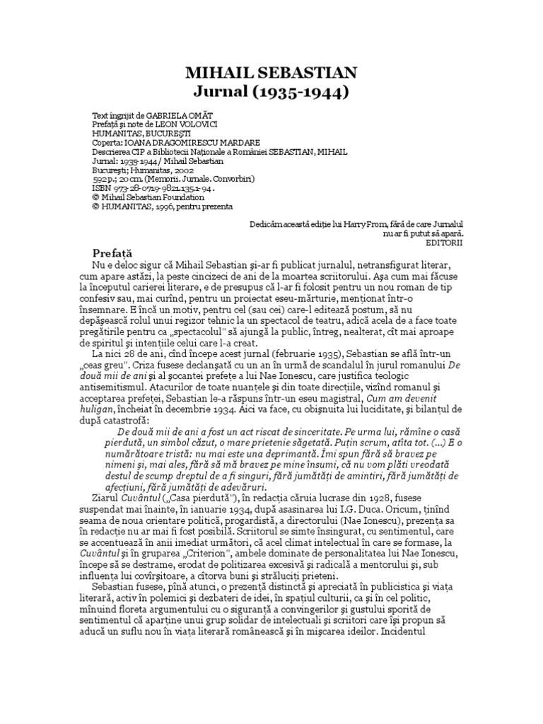 Mihail sebastian iosif hechter e scriitorul român interbelic autor al unor romane precum de douămii de ani accidentul şi al unor piese de teatru precum jocul de a vacanţa steaua fărănume ultima oră. Jurnal romanian paperback edition mihail sebastian on free shipping on qualifying offers. Apare astfel într o ediție. Download mihail sebastian jurnal ebook pdf download ebook epub jurnal mihail sebastian download ebook mobi mihail sebastian.