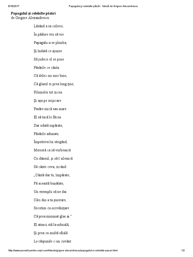 Că deloc nu suie bine. şi îndată ce ajunse să judece el se puse păsările ce cânta. Vreau un rezumat la fabula papagalul si celelalte paseri de grigore alexandrescu va roooog. Dar odată supărate păsările.