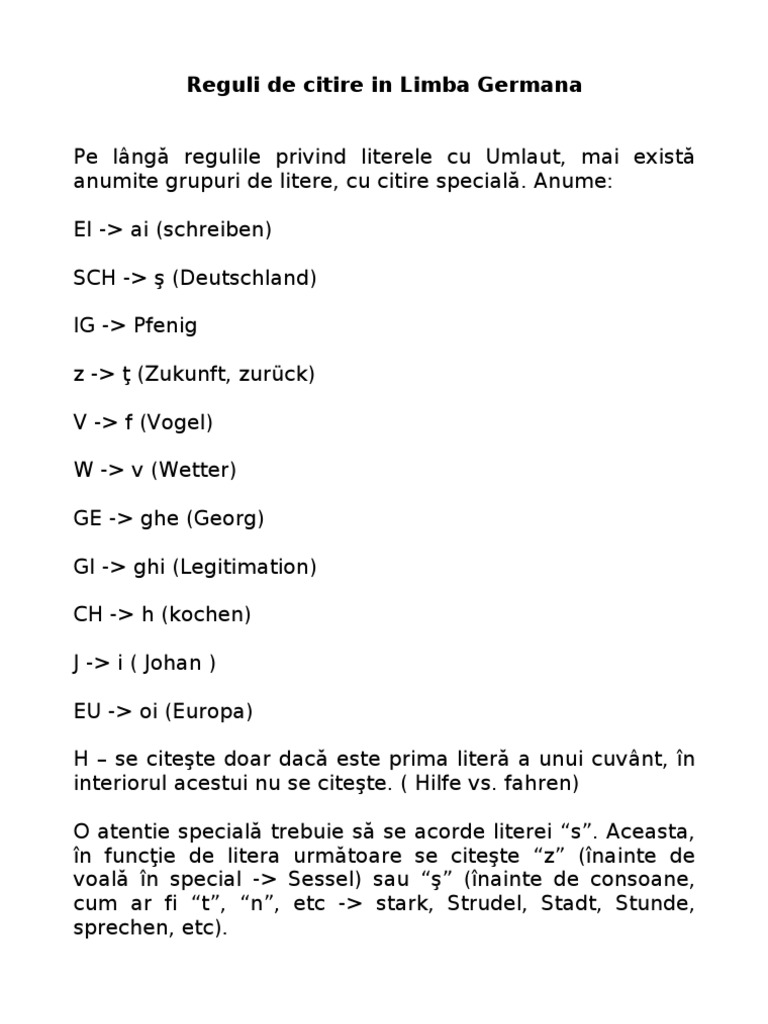 Ca urmare am încercat să definesc un set de reguli minime pe baza căruia un vorbitor începător să poată pronunța cât mai corect cuvintele germane. Pronunția literei r. Vocalele în limba germană. Pe lângă regulile privind literele cu umlaut mai există anumite grupuri de litere cu citire specială.