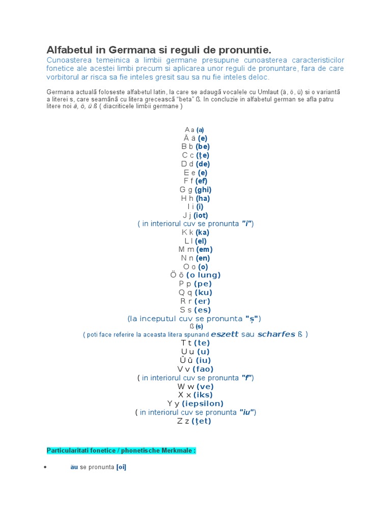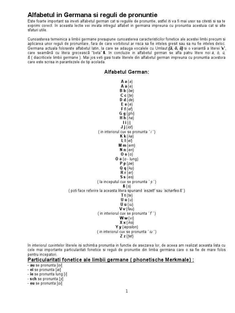 După cum veți observa vor apărea și litere care nu există în limba română. Pentru a vă putea exprima în limba germană este importantă cunoașterea alfabetului german și a regulilor de pronunție. Reguli de pronunție în germană consoane și grupuri de consoane ß scharfes s s ul ascuțit ß ul este corespondentul sunetului românesc s așa cum se aude el în cuvântul folos spre exemplu. Deși germana are reputația că.